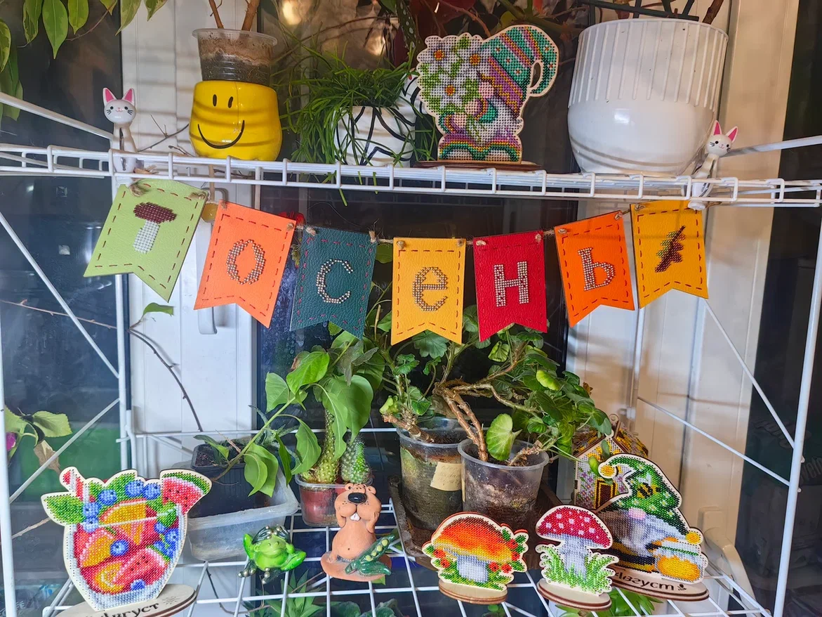 Зато собралась – и вышила осенние флажки. Повесила их на полке с геранями (на фото не видно, но там одна пеларгония цвести надумала в очередной раз) И тут же в кадре новый грибок от той же Аннушки – Мухоморчик. Им «дошивала» сериал «Отголоски эха». Скорее это был даже просто повод сериал досмотреть)) 5 из 5 – очень понравилось как закрутили сюжет. Правда финал подкачал, но зато теперь хочется пересмотреть «Белые воротнички» из-за главного актёра, он одну из главных ролей в «Отголосках» играл. Что подкачало – это подбор актёров на роли героев в юности. Как будто цель была наименее похожих отобрать.