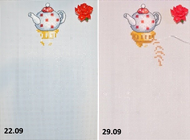 Скорость вышивки еще снизалась, и приходится возвращаться к формату «было-стало». Самовар радует бликом и намеком на связку баранок. Стихоплед в очередной раз продемонстрировал свой непростой характер. За один ряд до конца пришло понимание, что имеющаяся обвязка мне не нравится. Теперь я хочу распустить три внешних ряда и заново выровнять стыки квадратов.