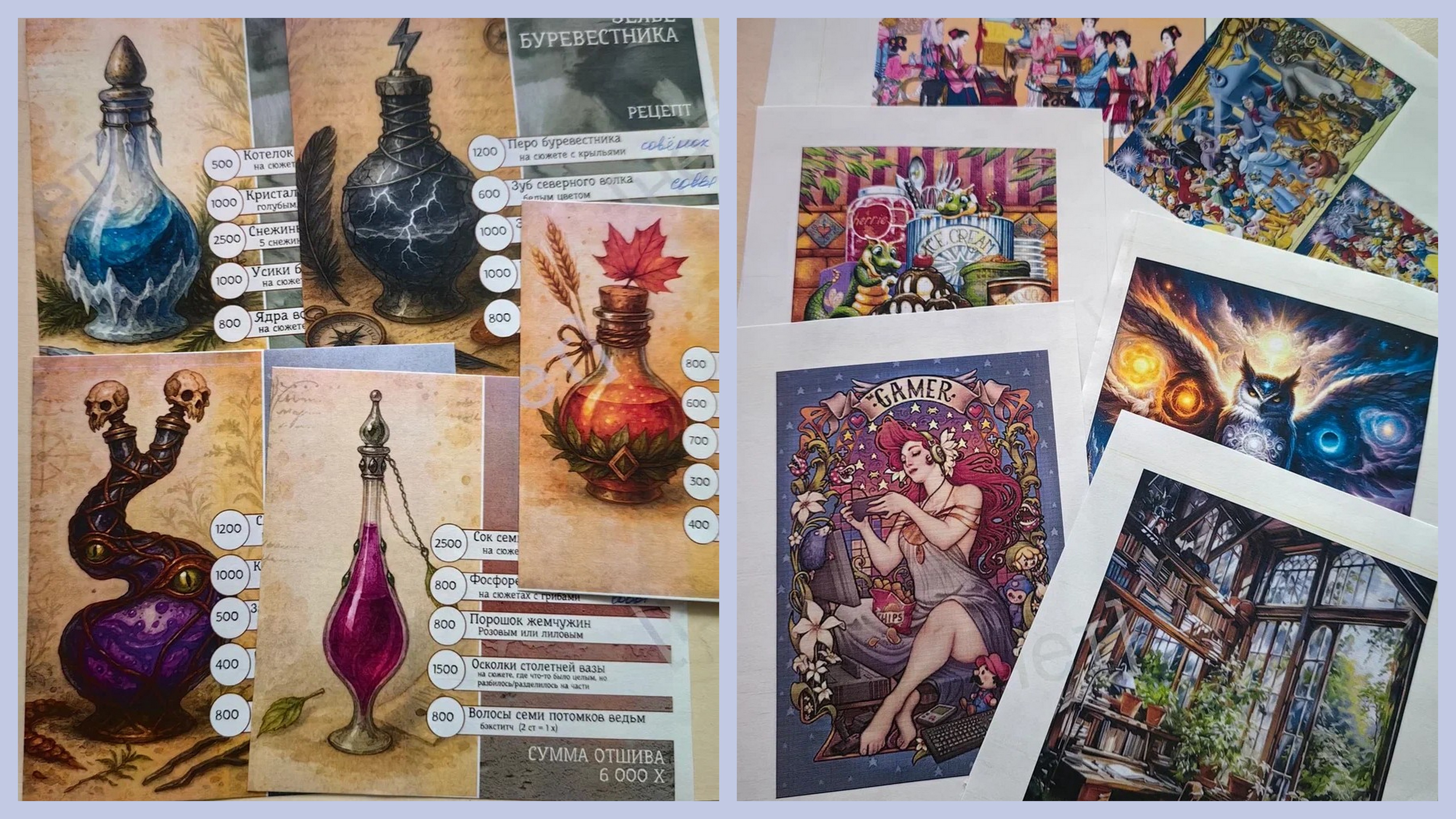 Вышла на тропу игры) О, игр у меня завались: и совместники – вступай-не хочу (отдельным списком куда уже вступила), и настольные игры, и онлайн. Все вышивальные, не просто игры (просто игр не меньше, хе-хе). Только желания не особо было, а тут на радостях близкой свободы появилось. Правда, времени как-то больше не стало и нервишки что в любой момент сорвут что-то делать, что надо быть готовой подхватить почти любой вопрос, далеко не убегая от рабочего места, и быть постоянно на связи пока ещё не успокоились) Но! Так долго смотрела на игру с зельями что таки созрела) Нет, в саму игру не вступила – мне первоначальные условия не понравились. Хотя уже успела запросить у нейронки похожу игру, только под процессы «Академии» от СЛ. Но руки никак не дойдут это всё в страницы блокнота оформить. Или хотя бы в нарезку наклеек для блокнота с играми. Зато руки дошли распечатать те самые зелья и превью больших работ. Буду постепенно отшивать многоцветки на зелья, уж очень жалко что они лежали пока все остатки сил на «Академию» уходили и летом как-то не срослось с активной вышивкой((
