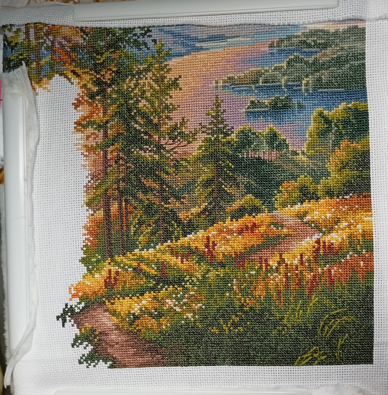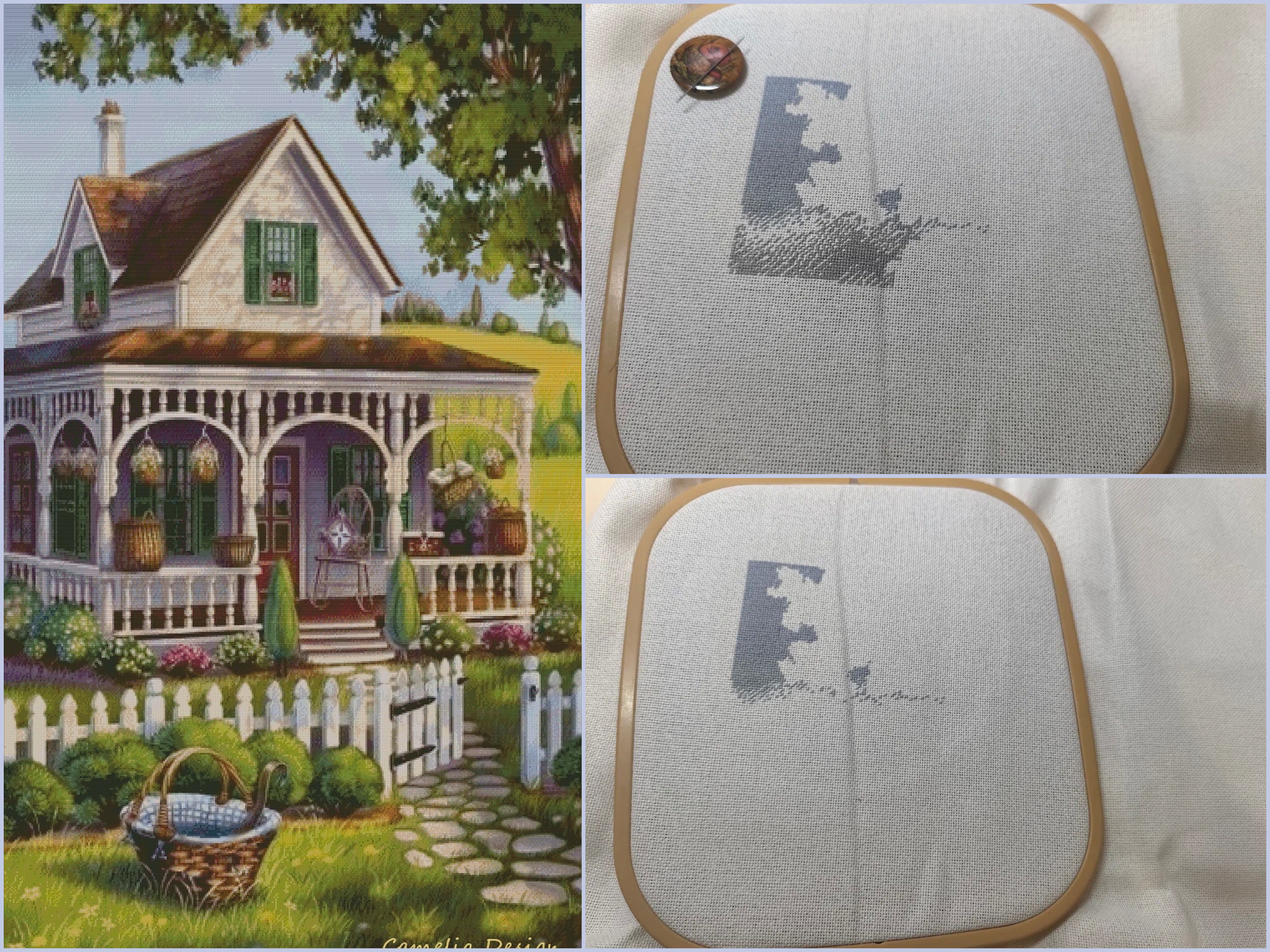 Первая работа, почти дошитая до нормы зелья с «чем-то голубым» – это «Летний коттедж». Заодно с ним в совместник у автора схемы влетела) Моя любимая норма – 200х в неделю) А тут 766 стежков прибавилось, если что)