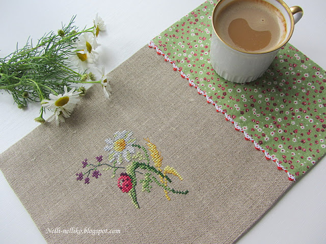 Приятная работа получилась. Полукрест в разных направлениях и в разное количество нитей, получается очень объемно. Надеюсь, что после оформления этот объем не уйдет.